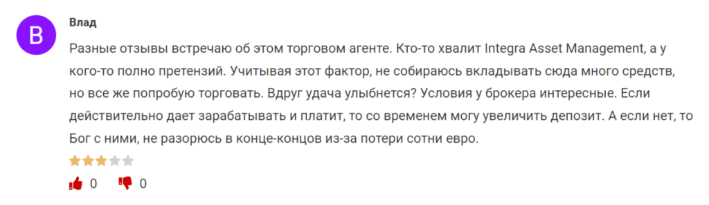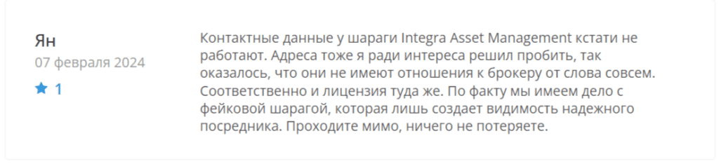 С учетом короткого срока работы, отзывов о компании Integra Asset Management не так много, и большинство из них связаны с проверками, которые трейдеры проводят перед инвестициями. Рассмотрим некоторые из них.
