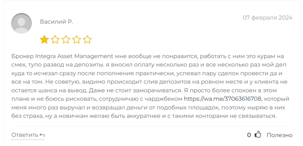 Василий, добавивший отзыв, также не остался доволен платформой Integra Asset Management, утверждая, что там просто выманивают деньги. Несмотря на неудачи, он продолжает работать с такими проектами, так как ему удавалось иногда возвращать средства.